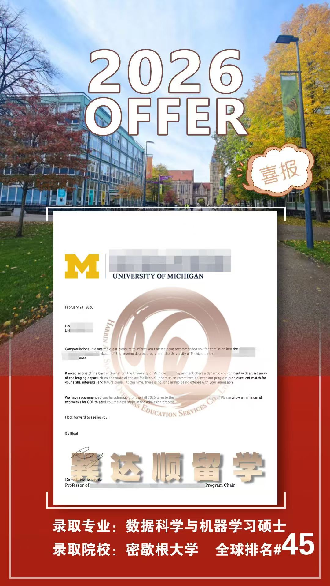棒棒哒~恭喜我们的Wang同学获得密歇根大学数据科学与机器学习硕士Offer,点赞~